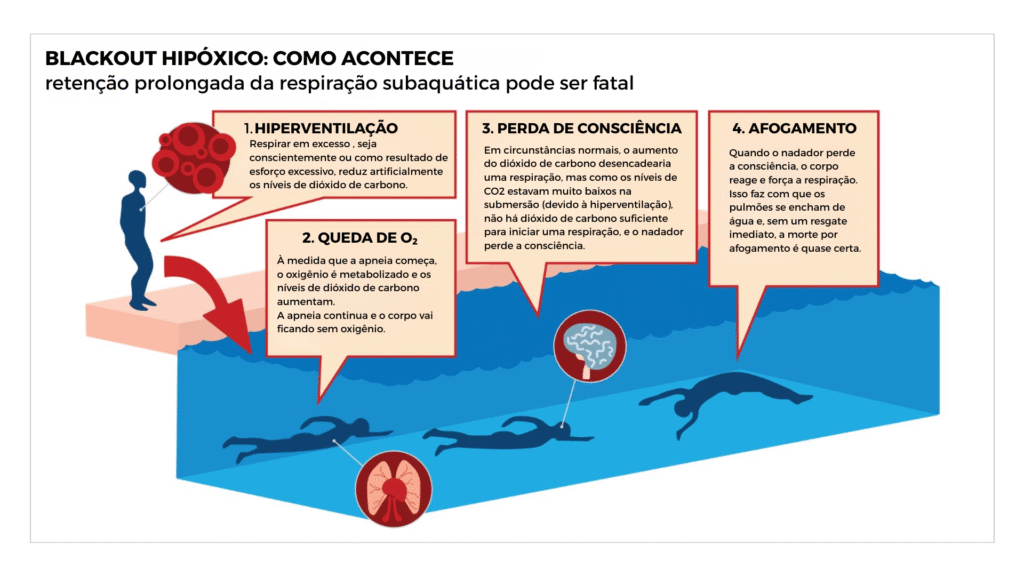 Durante a subida, a redução repentina da pressão faz o oxigênio remanescente se redistribuir, o que pode levar a um blackout hipóxico — um desmaio causado pela queda abrupta dos níveis de oxigênio no cérebro.