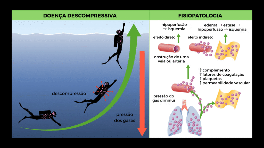 Quando um mergulhador sobe rápido demais, o nitrogênio dissolvido no sangue forma bolhas gasosas, num processo semelhante ao que ocorre ao abrir uma garrafa de refrigerante. Essas bolhas podem bloquear vasos sanguíneos, causando paralisia, danos neurológicos e, em casos graves, a morte.
