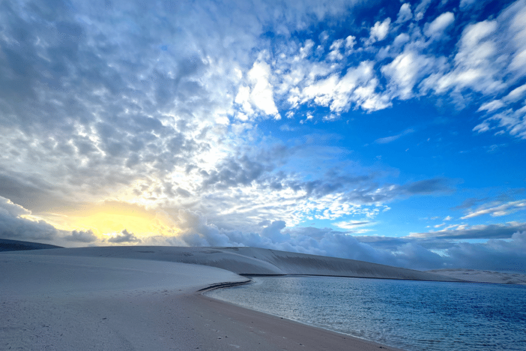 A travessia nos Lençóis Maranhenses é daquelas experiências que marcam para sempre. Uma combinação de esforço físico e momentos de pura contemplação, quando tudo o que existe é você, o vento e o cenário ao redor. Depois de dois dias intensos, de Atins até Baixa Grande e, em seguida, de Baixa Grande até Queimada dos Britos, chega o tão esperado terceiro dia. É quando o corpo já sente o peso da jornada, mas a expectativa pela recompensa final é ainda maior. Esse é o dia marcado pela partida antes do amanhecer, pelo nascer do sol arrebatador e pela chegada à imponente Lagoa do Junco — um dos lugares mais emblemáticos de todo o Parque Nacional dos Lençóis Maranhenses.